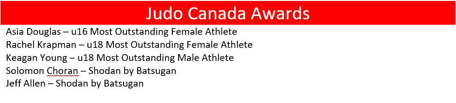 On the fourth and final day of the Canadian Open Judo Championships the Senior athletes were competing for the medals. Team Ontario had four athletes reach the second level of the podium and five others winning bronze. Also on Sunday evening at the National banquet the Annual National awards were given out with several Ontario athletes receiving national recognition. Congratulations go to Asia Douglas who won the U16 Outstanding Female award. Additionally Rachel Krapman and Keagan Young won the U18 female and male awards. During the award ceremony Fred Blaney the Chair of the National Grading Board awarded by Batsugan Solomon Choran and Jeff Allen with their Shodans Please see Sunday’s results below:
